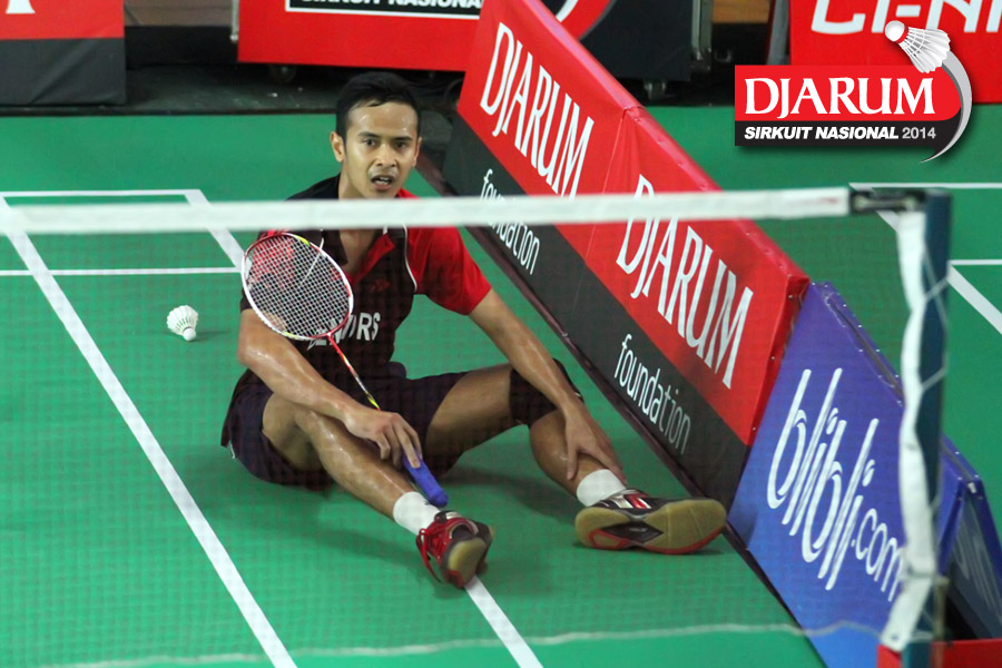 Akbar Gusti/Ardy Nugroho (PB Djarum) menghadang serangan bertubi-tubi yang dilepaskan pasangan Amri Syahnawi/Riyan Tri (SKO Ragunan).