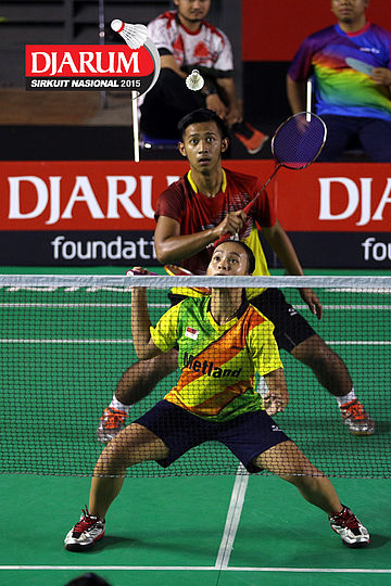 M. Taufiqul/Vanadia Pranasa (Djarum Kudus) berusaha menghadang serangan
