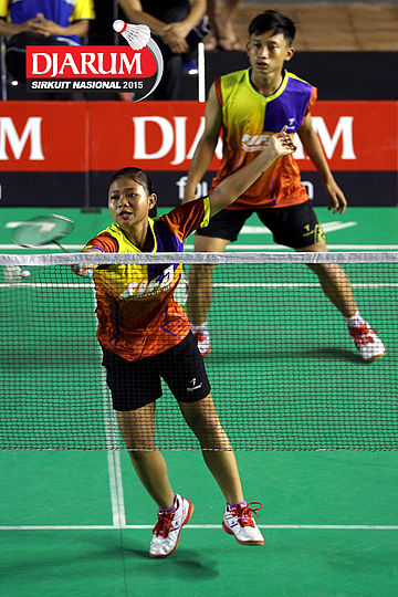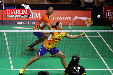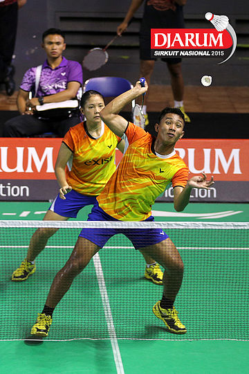 Hendra Gustiawan/Brigita Marcelia (Bandar Baru/Exist) mengembalikan shuttlecock