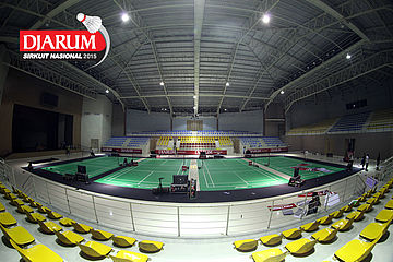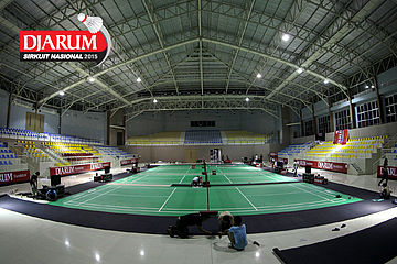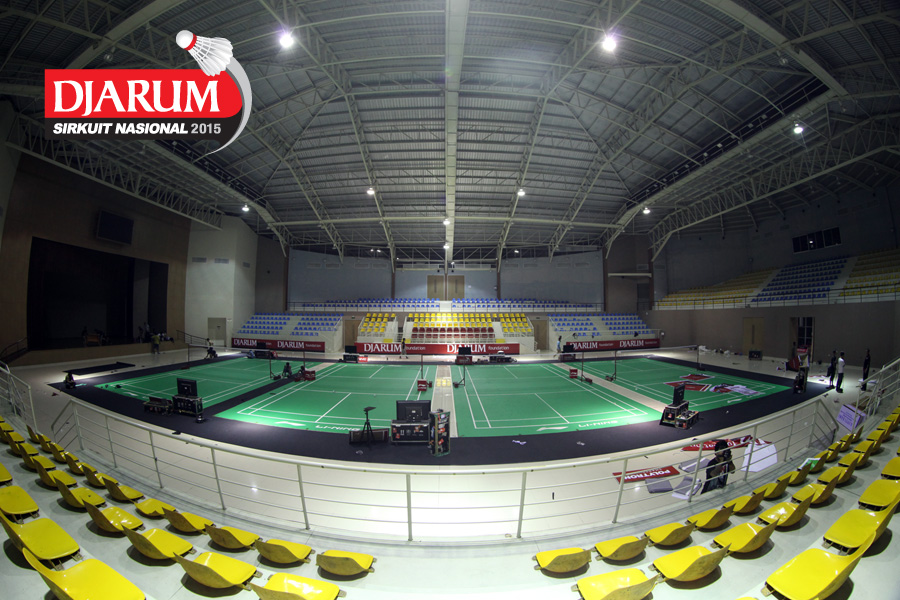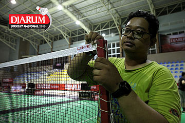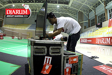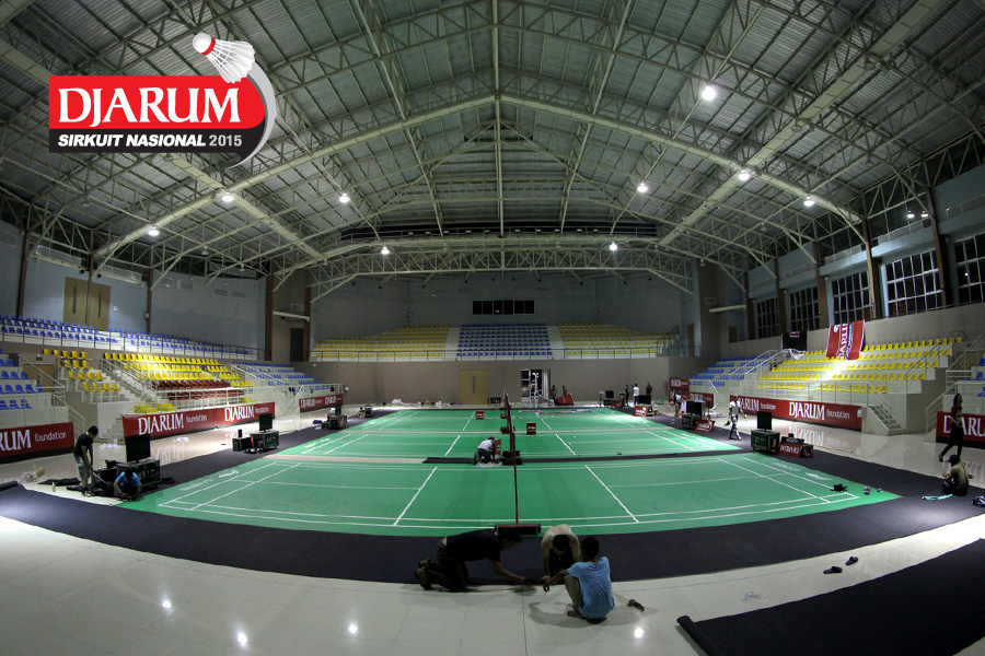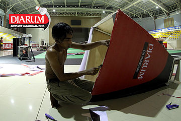 Seorang pekerja memasang dekorasi Djarum Sirkuit Nasional 2015.