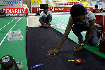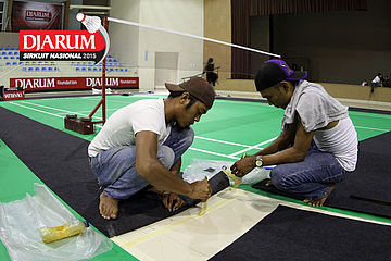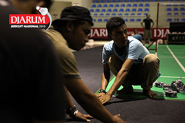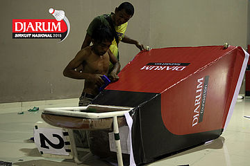 Dua pekerja pekerja memasang dekorasi Djarum Sirkuit Nasional 2015.