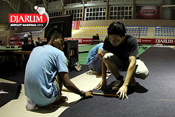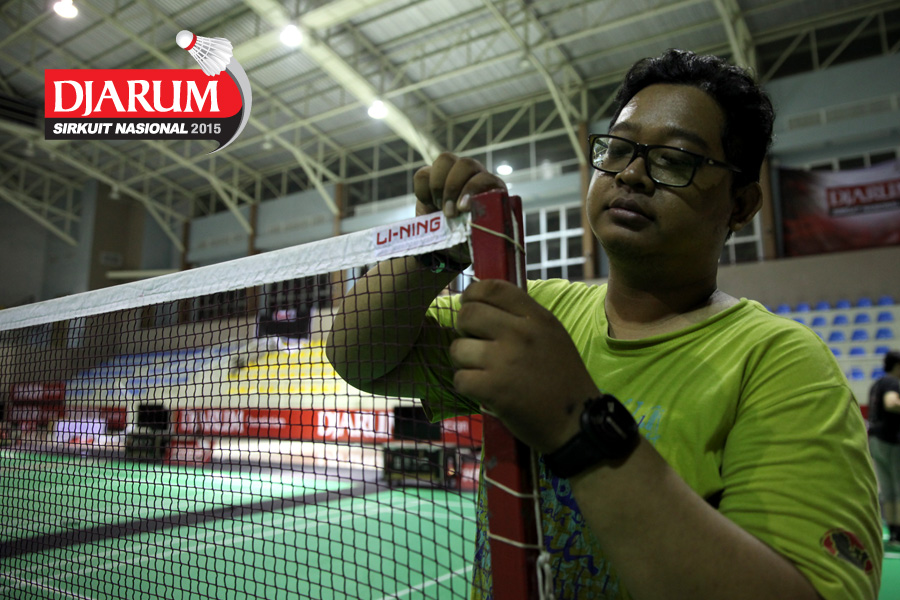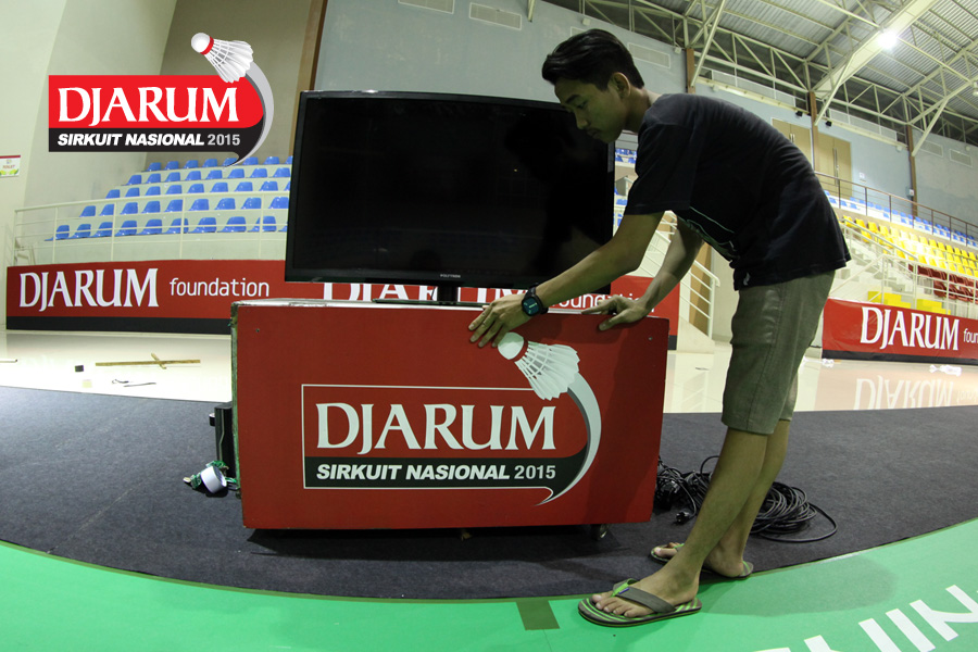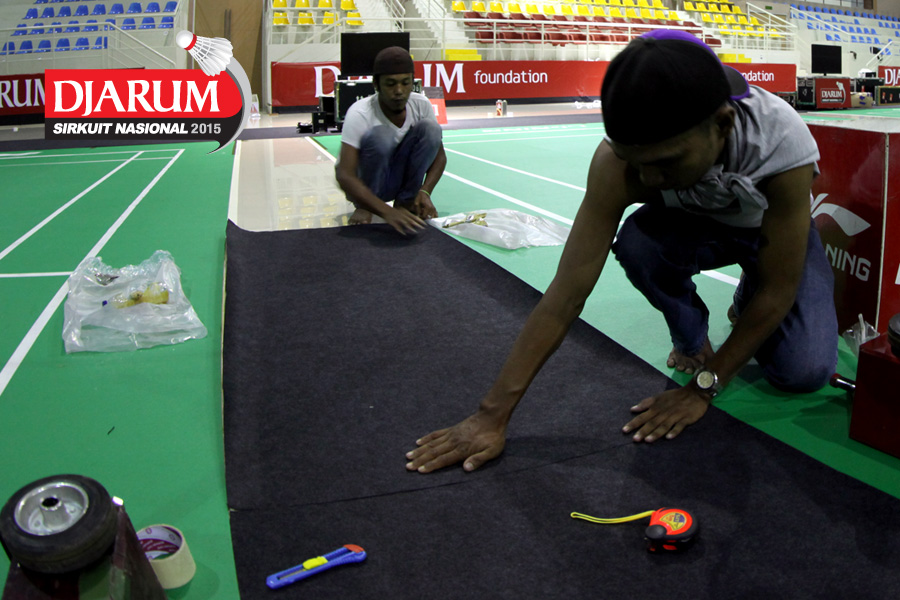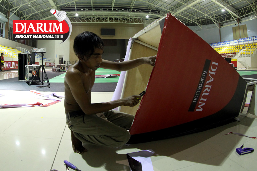 Salah satu pekerja memasang dekorasi Djarum Sirkuit Nasional 2015.