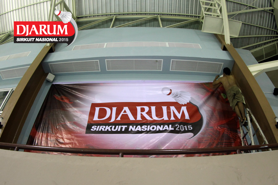 Salah satu pekerja memasang spanduk Djarum Sirkuit Nasional 2015.