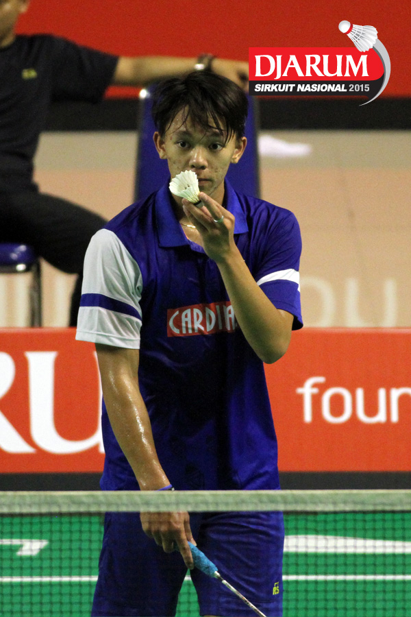 Yohanes Kevin (Mutiara Cardinal) meminta pergantian shuttlecock.