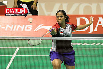Marsa Indah (Galaxy Sidoarjo) mengembalikan shuttlecock.