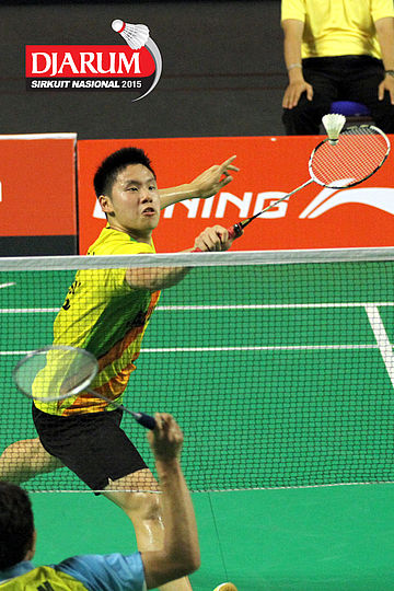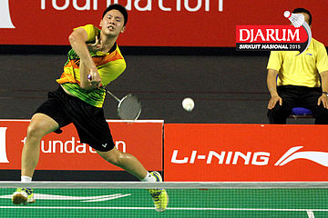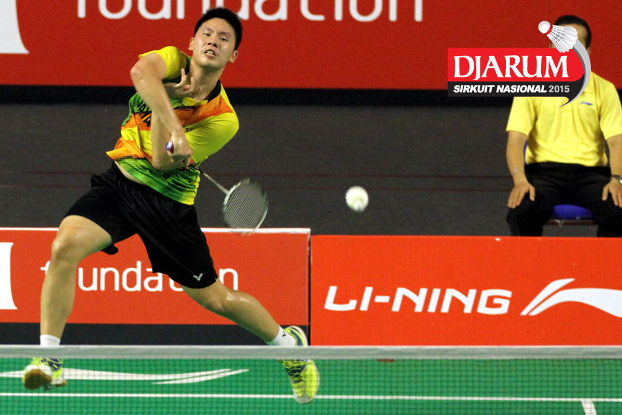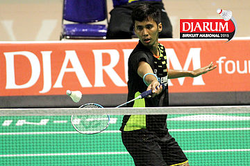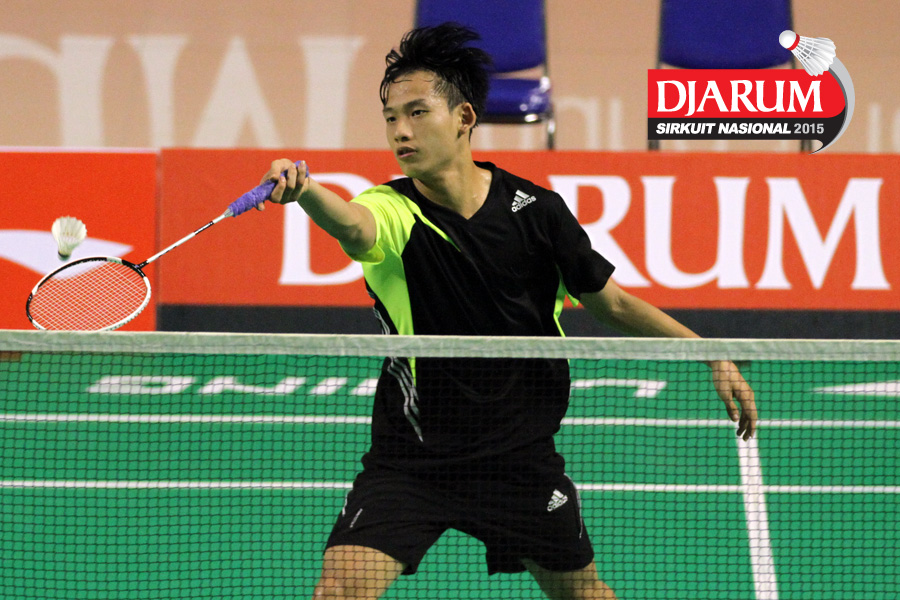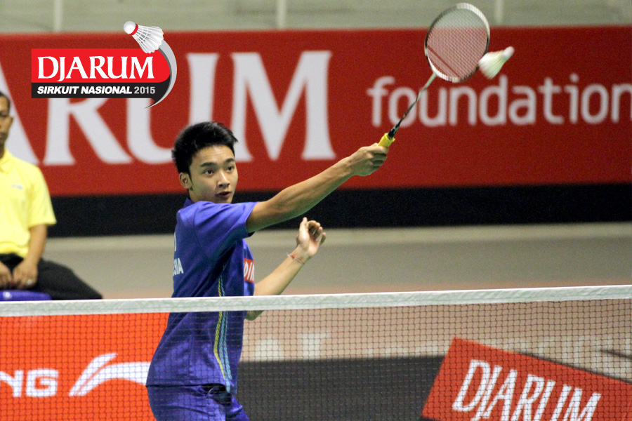 Alamsyah Yunus (JR Enkei) mengembalikan shuttlecock.