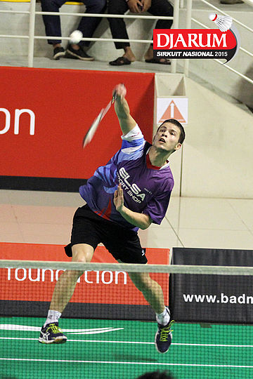 Metej Polacek (Slovakia) mengembalikan shuttlecock.
