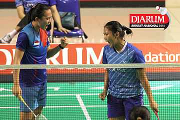 Dianita Saraswati/Yulfira Barkah (Mutiara Cardinal) menyambut serve.