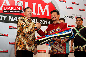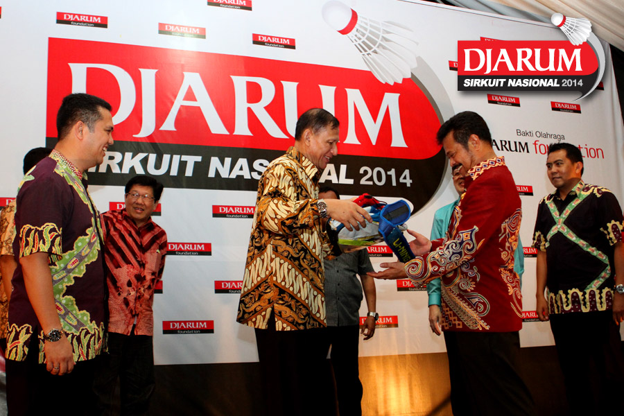 Wakil Ketua Umum I PP PBSI, Fuad Basya (kiri) saat menyerahkan simbolis tanda dibukanya gelaran Djarum Sirkuit Nasional Li-Ning Sulawesi Selatan Open 2014 kepada Gubernur Sulawesi Selatan, Syahrul Yasin Limpo.