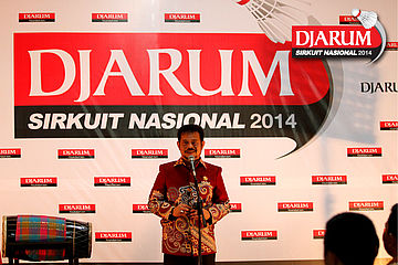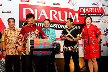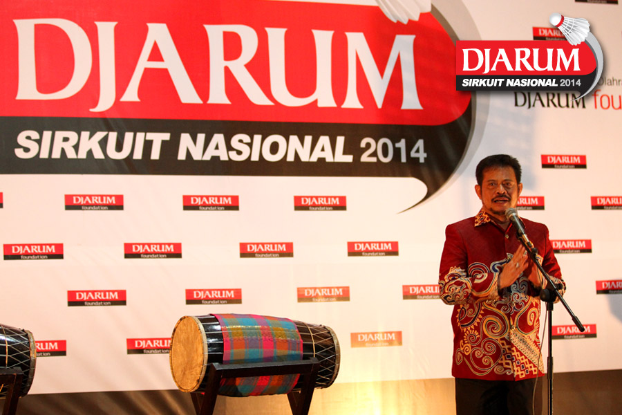 Gubernur Sulawesi Selatan, Syahrul Yasin Limpo saat memukul gendang yang menyatakan gelaran Djarum Sirkuit Nasional Li-Ning Sulawesi Selatan Open 2014 secara resmi dibuka.