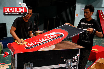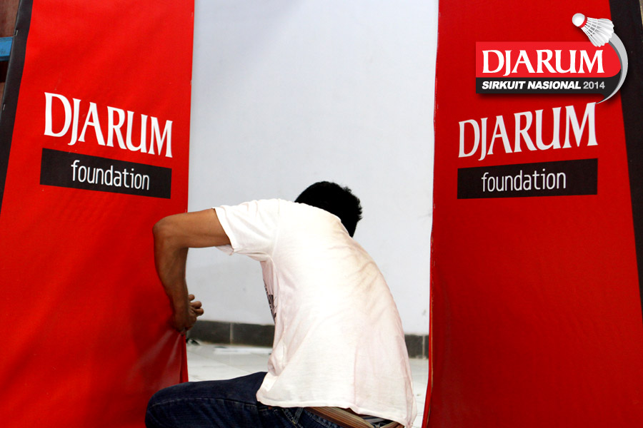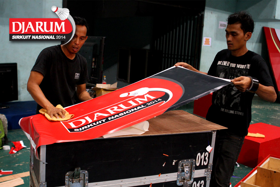 Dua orang pekerja saat menempelkan add board Djarum Sirkuit Nasional 2014.