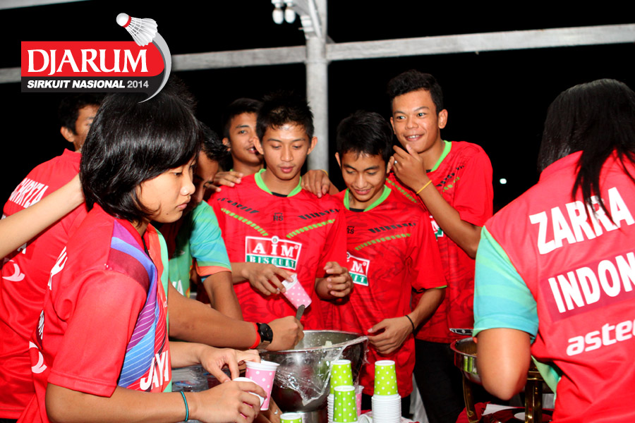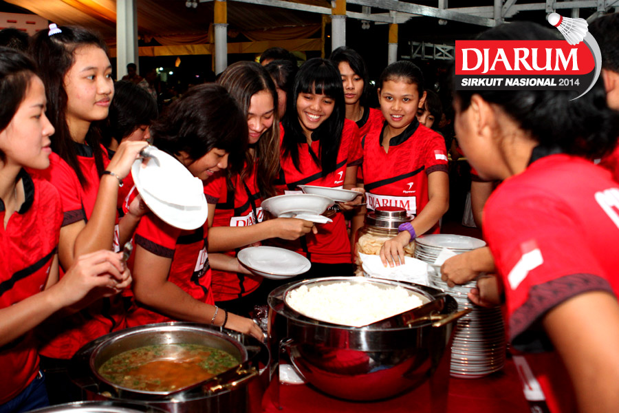 Beberapa pebulutangkis Jaya Raya Suryanaga bersiap menyantap makan malam yang tersaji di dalam acara Welcome Dinner Djarum Sirkuit Nasional Li-Ning Sulawesi open 2014 di Rumah Jabatan Gubernur Sulawesi Selatan.