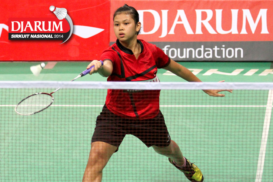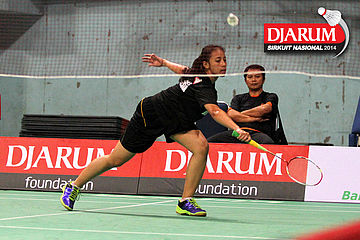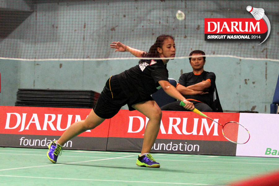 Rifa Putri (PB Djarum) mengembalikan shuttlecock ke arah Adinda Putri (Tangkas Specs).