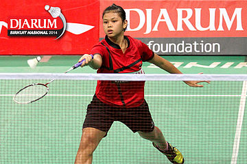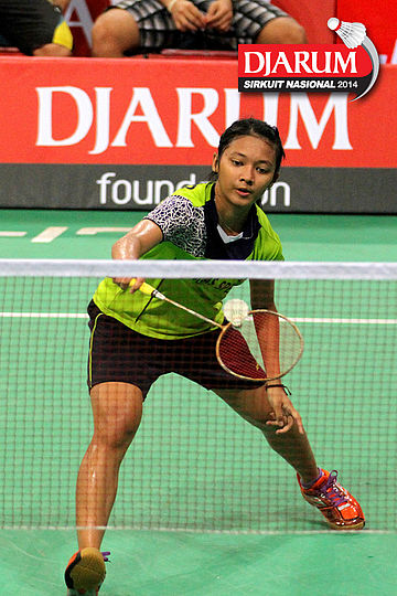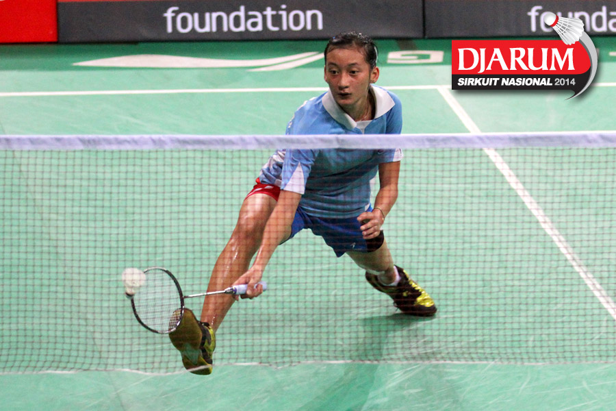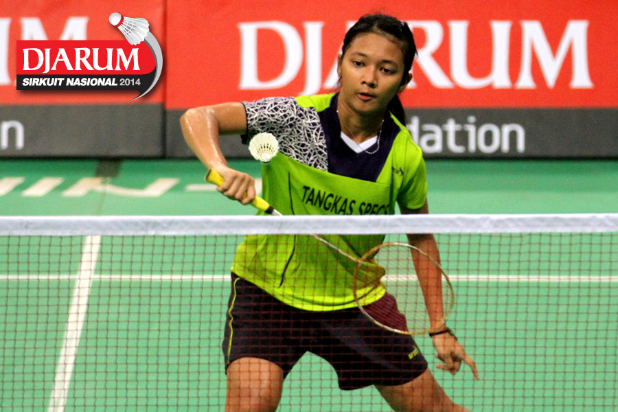 Mia Mawarti (Guna Dharma) bersiap menyambut pengembalian shuttlecock dari Syakila Syifa (Exist).