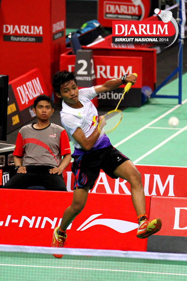 Hiski/Hasri (Jaya Raya Suryanaga) gagal menghadang smash keras yang dilepaskan pasangan ganda campuran remaja Mutiara Bandung, Selamet Nurcahyo/Jessica Wardana.