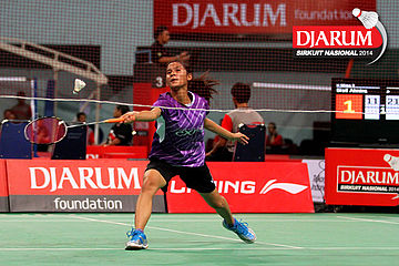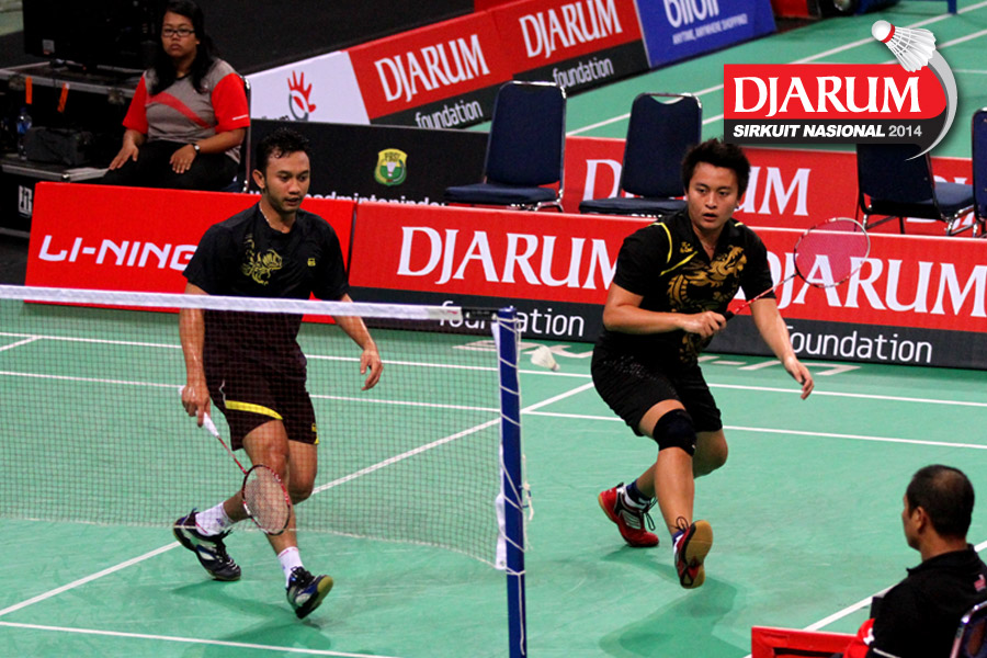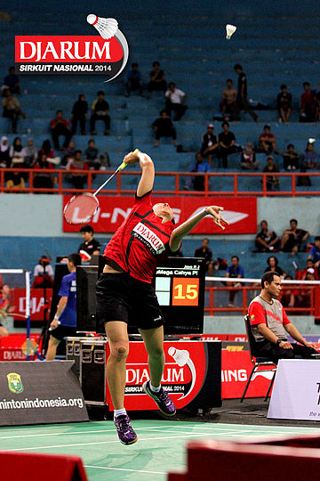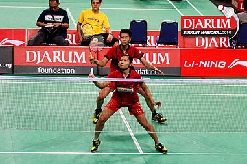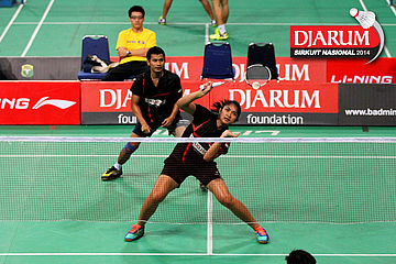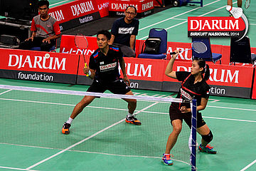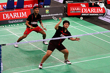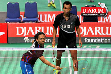 Arsya Isnanu/Meiliana Jauhari (PB Djarum) bersiap menyambar pengembalian tanggung dari Stefan Indra/Aris Budiharti (Mutiara Bandung/Jaya Raya).