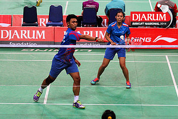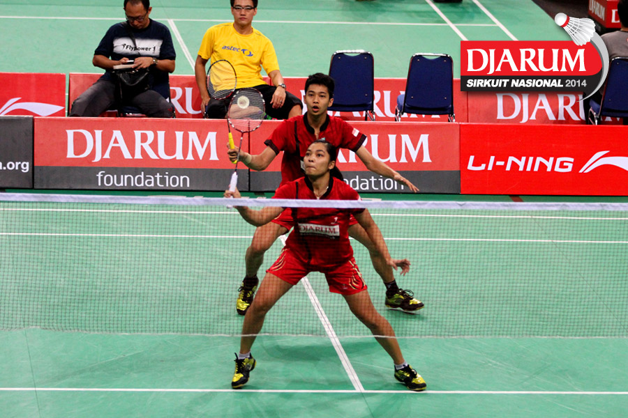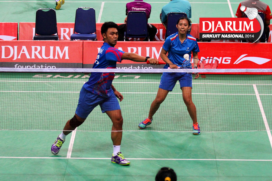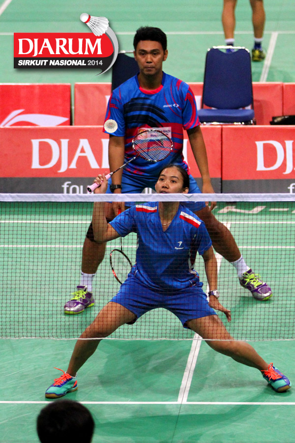 Kenas Adi/Komala Dewi (PB Djarum) berhasil mengembalikan shuttlecock ke arah Tri Kusuma Wardhana/Variella Aprilsasi (Jaya Raya Suryanaga).