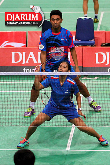 Afiat Yuris/Nurbeta Kwanrico (PB Djarum) bersiap menyambut pengembalian shuttlecock dari pasangan Rizky Hidayat/Nadya Melati (Hi Qua Wima/Pertamina Indonesia).