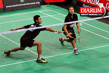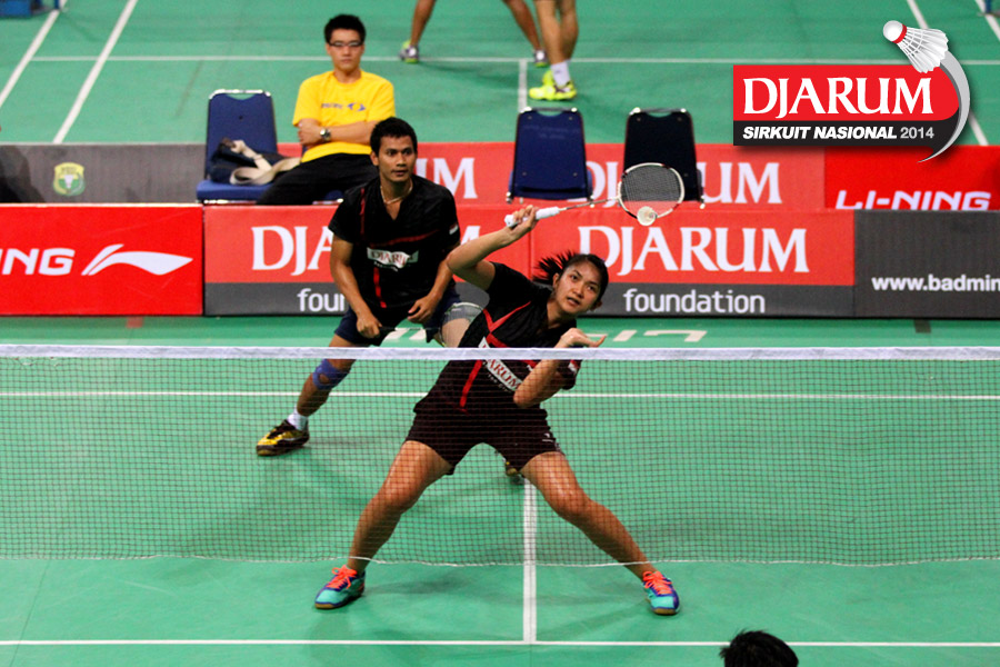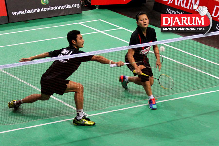 Didit Juang/Deariska Putri (PB Djarum) menyambar pengembalian tanggung dari M. Asykuru/Natalia Poluakan (IPC/Tangkas).