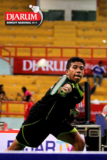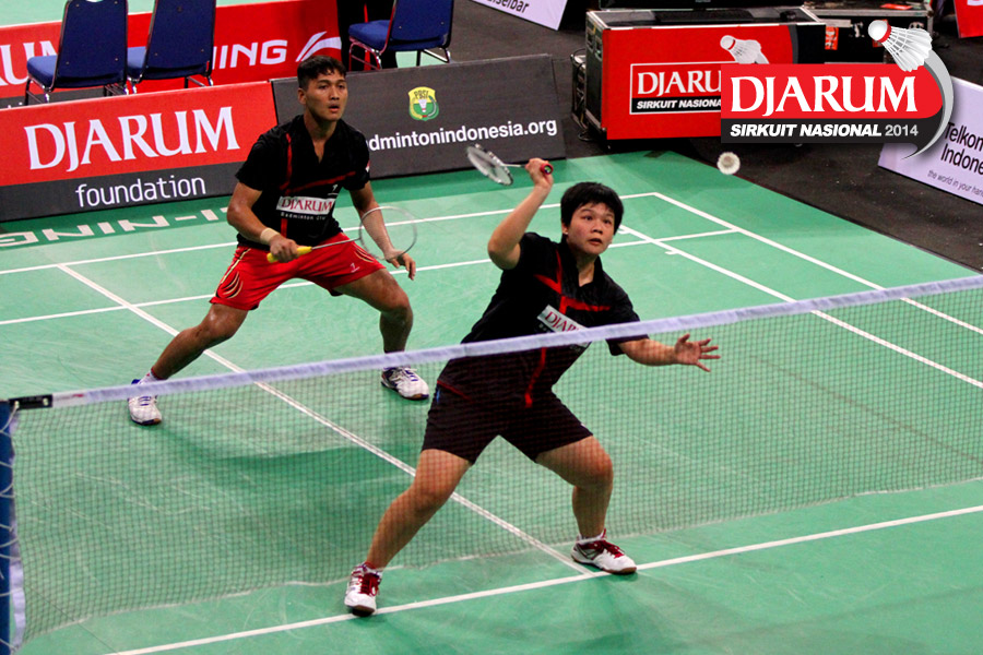 Ricky Alverino/Ristya Ayu (PB Djarum) menyambar pengembalian tanggung yang dilepaskan pasangan Kristian Gosal/Andreani (Avanti Makassar/Citra Raya Unesa).