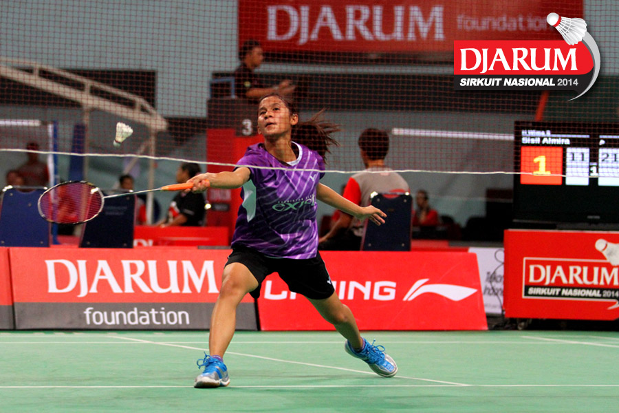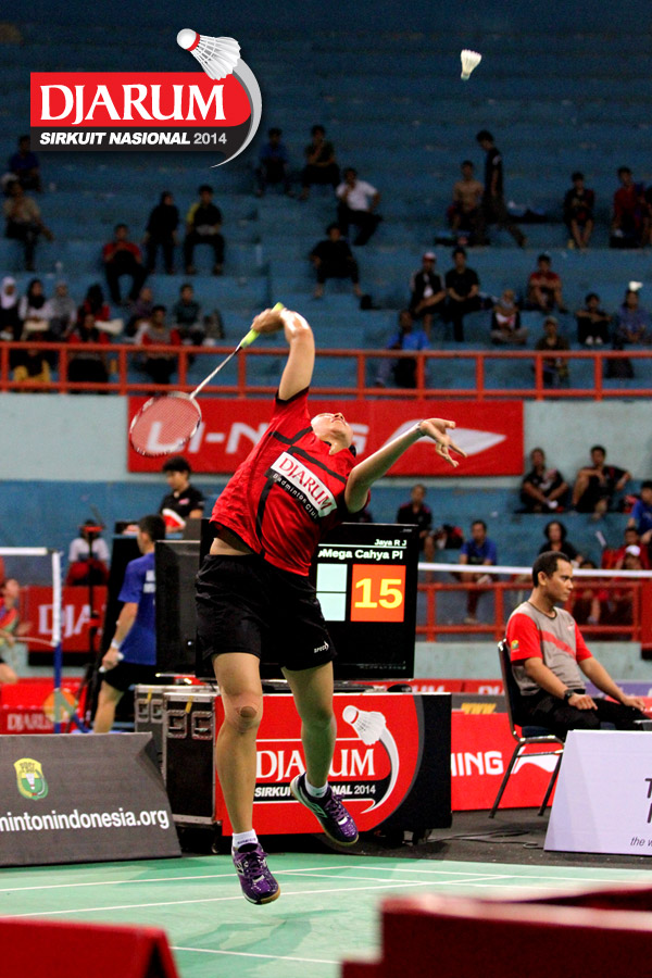 Febby Angguni (PB Djarum) bersiap melepaskan smash ke arah Mega Cahya (Jaya Raya).