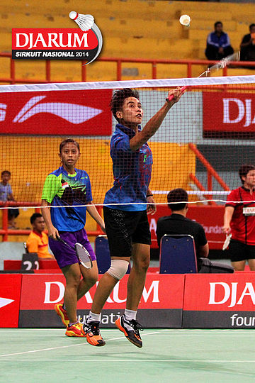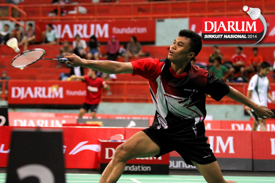 Eka Fajar (Jaya Raya) mengembalikan shuttlecock ke arah Ari Januari (Tangkas).
