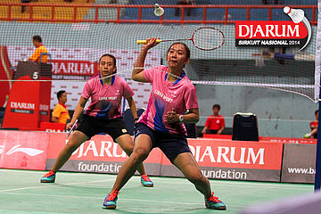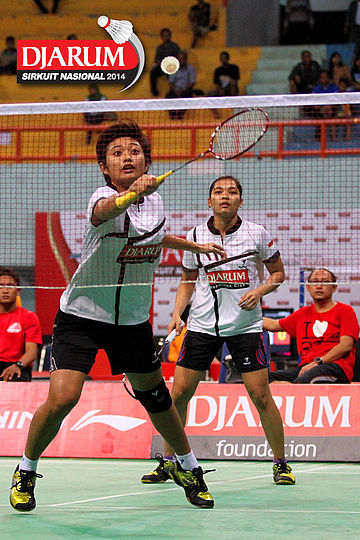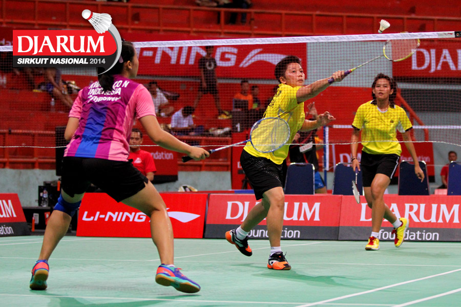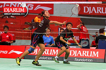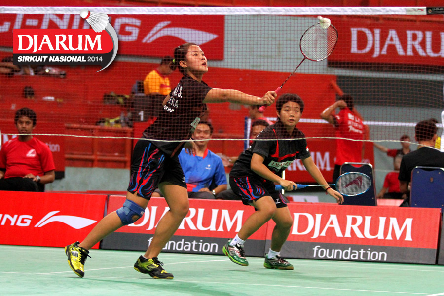 Khaeriah Rosmini/Natalia Poluakan (ICLI Gowata/Tangkas) menyambar pengembalian dari Deariska Putri/Nurbeta Kwanrico (PB Djarum).