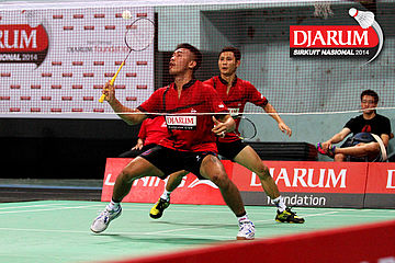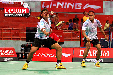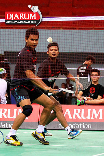 Didit Juang/M. Ulinnuha (PB Djarum) bersiap mengembalikan shuttlecock ke arah Fajar Alfian/Ridho Akbar (SGS PLN/Halim).