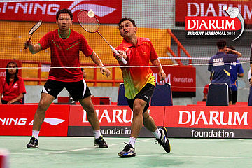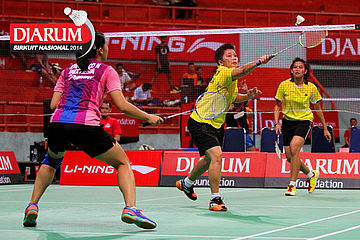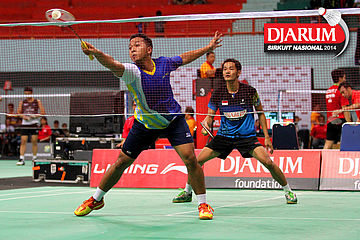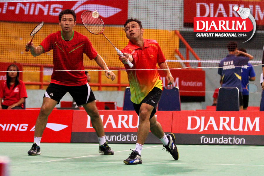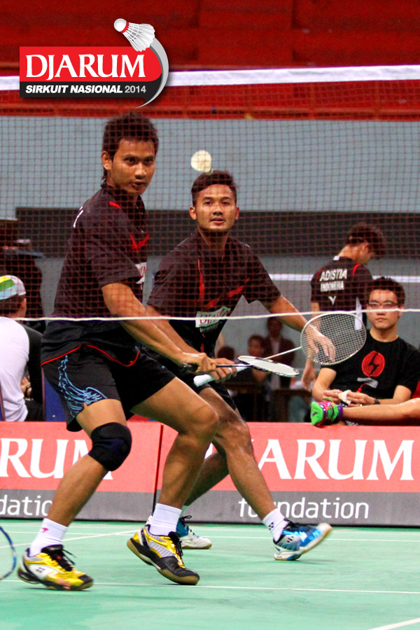 Kenas Adi/Rangga Yave (PB Djarum) berhasil menghadang serangan yang dilepaskan Riyo Arif/Rizky Hidayat (Hi Qua Wima).