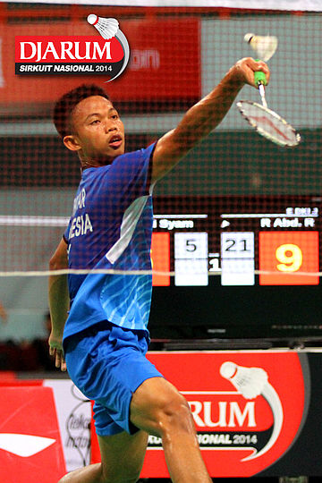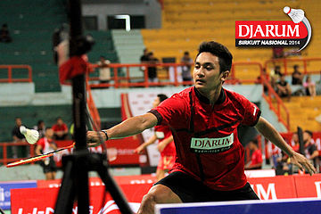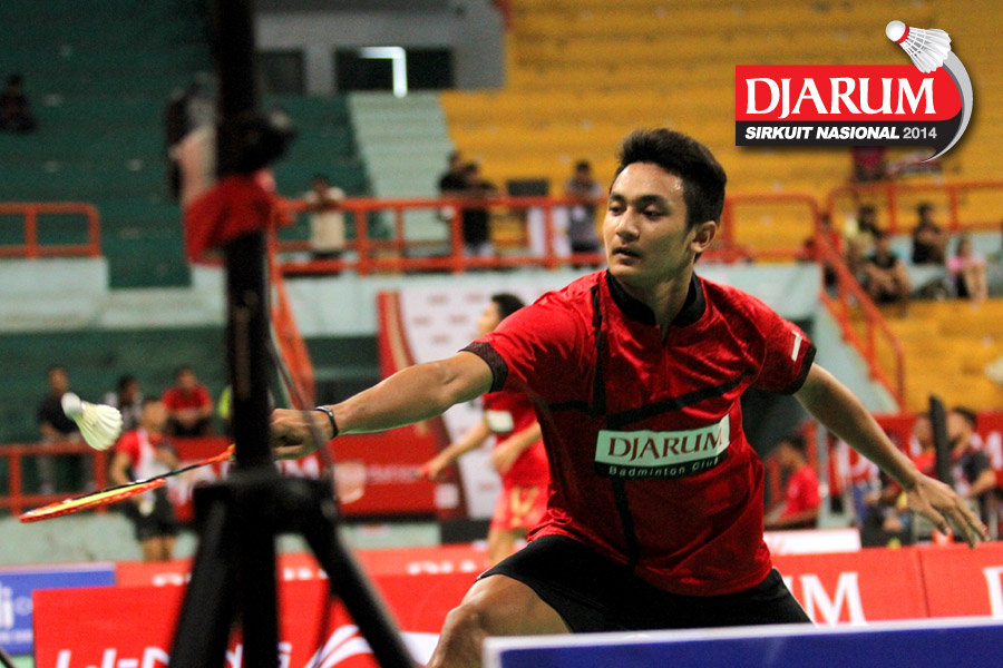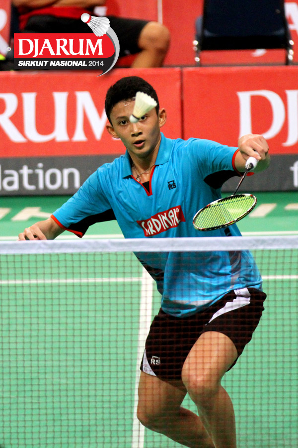 Adnan (Jaya Raya Suryanaga) mengembalikan shuttlecock ke arah Kho Hendrikho (PB Djarum).