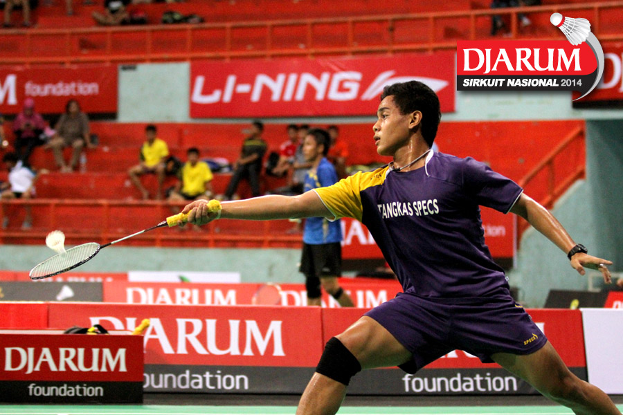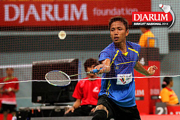 Thomi Azizan (PB Djarum) mengembalikan shuttlecock ke arah I Putu Roy Danu (Semen Gresik).