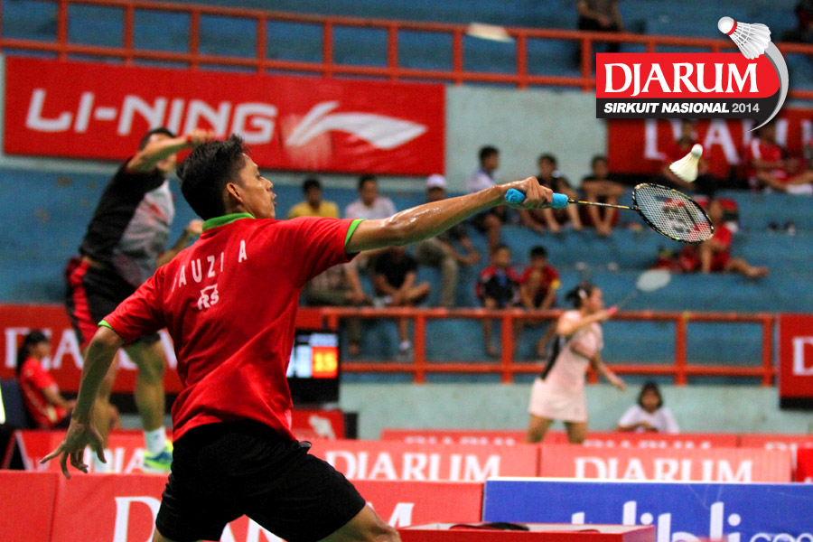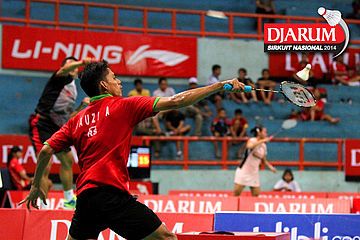 Kho Hendrikho (PB Djarum) mengembalikan shuttlecock ke arah Fauzi Adnan (Jaya Raya Suryanaga).