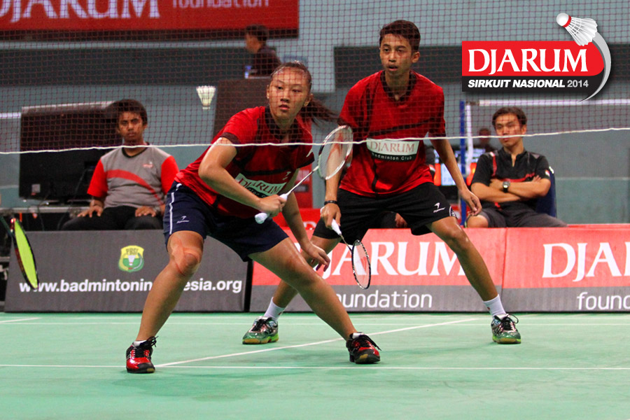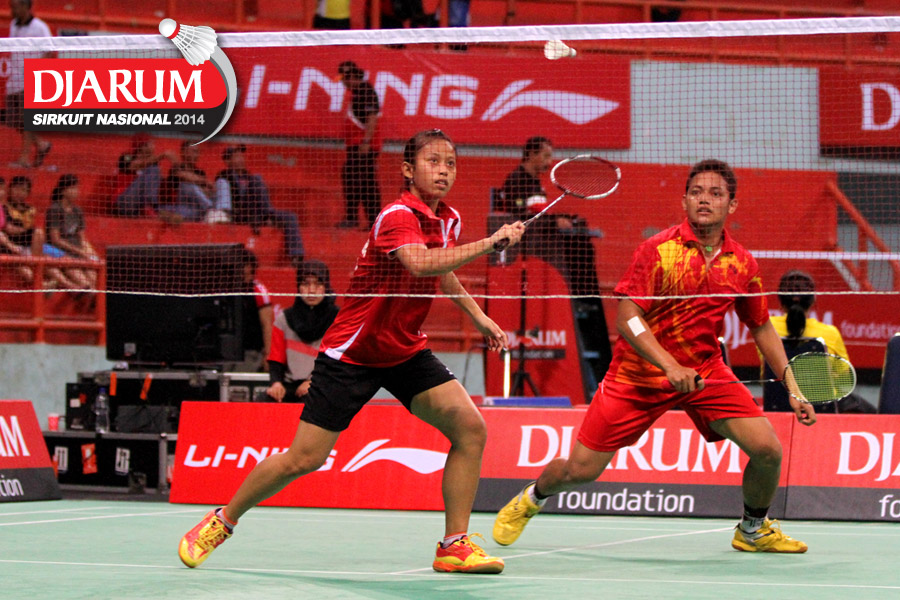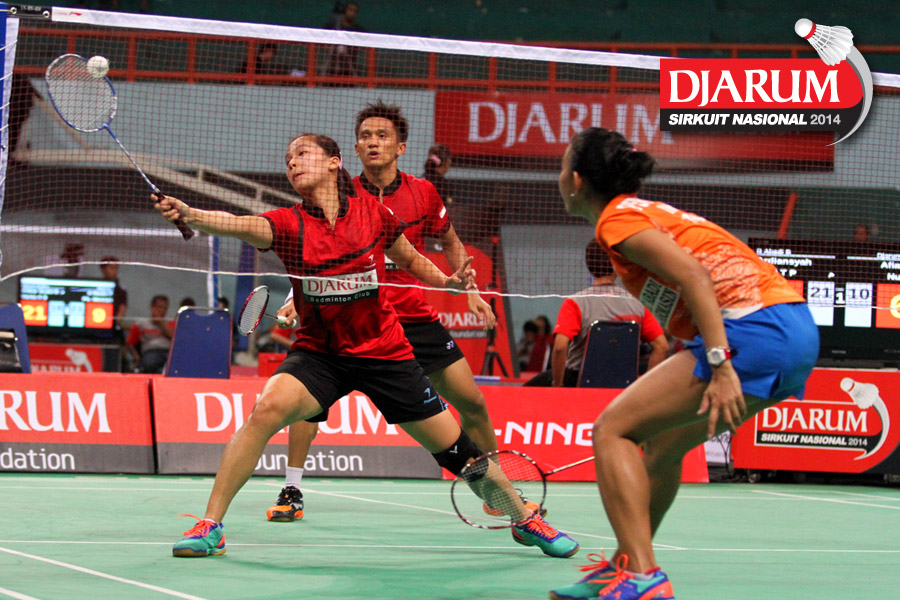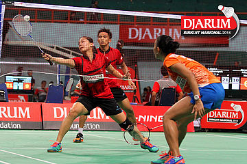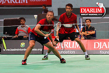 Arsya Isnanu/Meiliana Jauhari (PB Djarum) bersiap menyambut pengembalian dari Riyo Arief/Dian Fitriani (Hi Qua Wima/Jaya Raya).