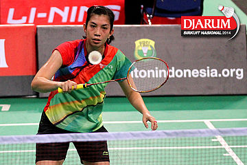 M. Shulton (Mutiara Bandung) mengembalian shuttlecock ke arah Enzi Shafira (Mutiara Bandung).