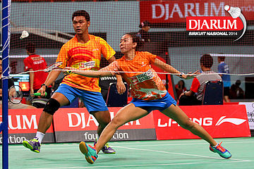 M. Robi Darwis/Monika Insany (Mutiara Bandung) menyambar pengembalian tanggung dari pasangan Arief Dwiyanto/Sri Fatmawati (Pelatcab Kab. Probolinggo).