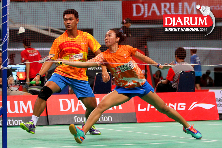 Riyo Arief/Dian Fitriani (Hi Qua Wima/Jaya Raya) berusaha mengembalikan shuttlecock ke arah Arsya Isnanu/Meiliana Jauhari (PB Djarum).