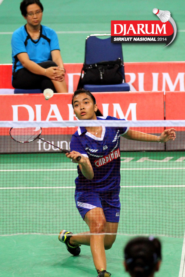 Linda Mutiara (Mutiara Bandung) bersiap mengembalikan shuttlecock ke arah Aida Arum (PB Djarum).