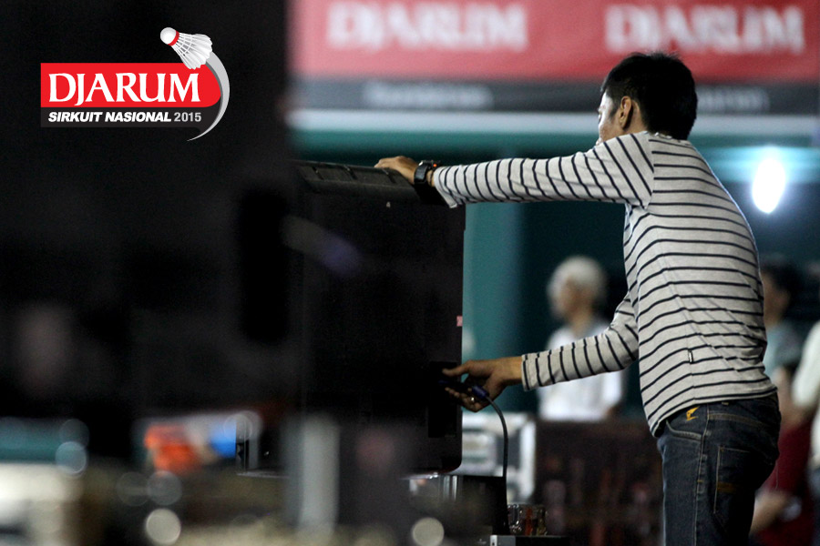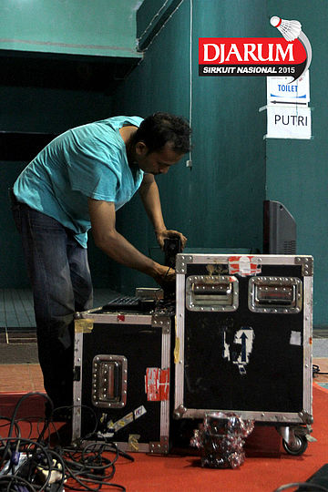 Salah satu pekerja membuka bungkusan perlengkapan live score.