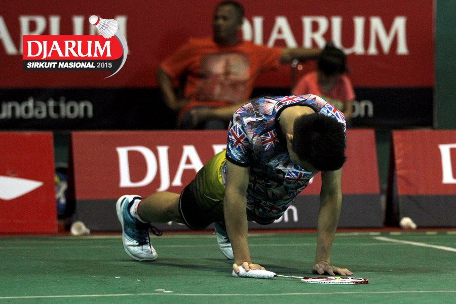 Salah satu atlet terjatuh saat berlatih di GOR Arie Lasut Manado, Sulawesi Utara sebelum penyelenggaraan Djarum Sirkuit Nasional Li-Ning Sulawesi Utara Open 2015.