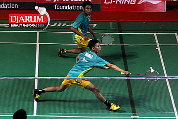 Handy/Leonard (Winner BC Manado) menghadang pengembalian dari Andika Daud/Ronal Kinga (Billionaires Gorontalo).