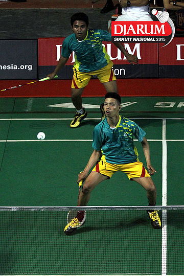 Chan/Oky (Mulia Manokwari) bersiap menyambut pengembalian dari Idris Ali/M. Danu (PBSI Maluku Utara).