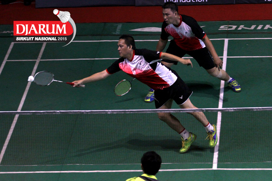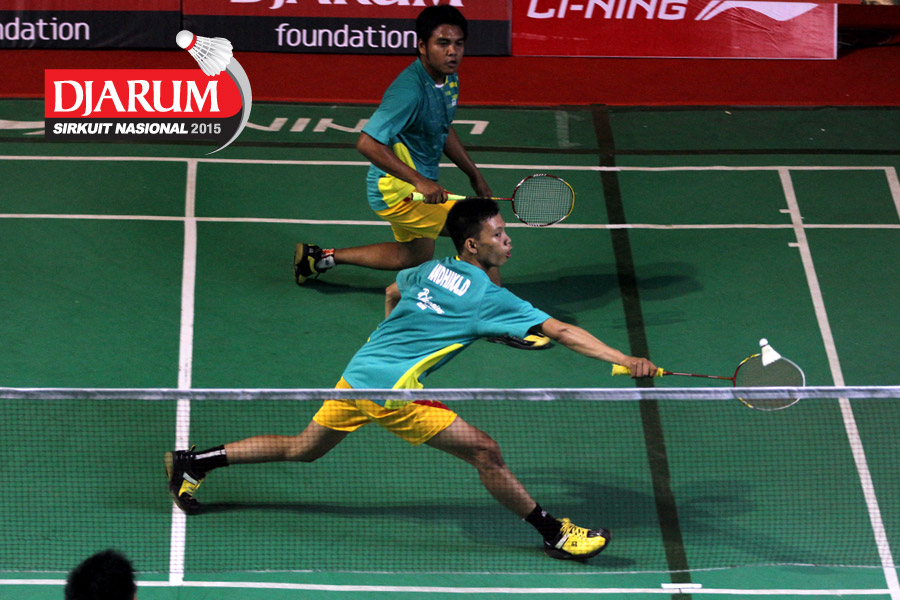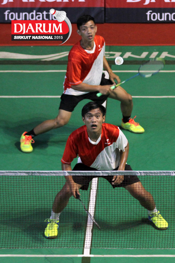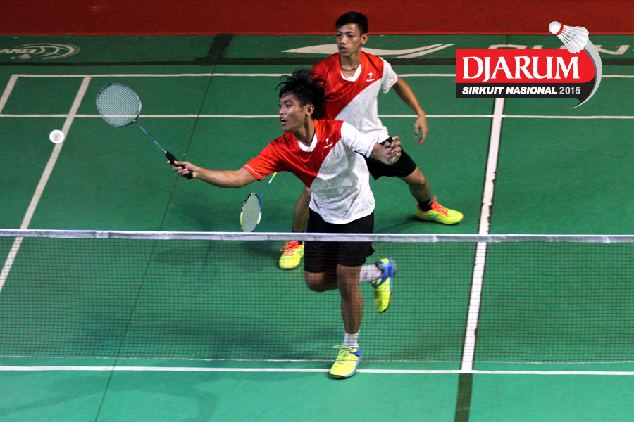 Jordi/Vincent (Mulia Manokwari) menghadang pengembalian dari Adrian/Muhidin (Winner BC Manado).