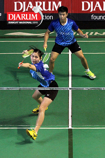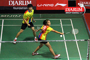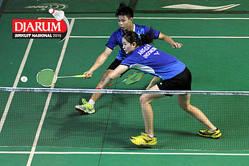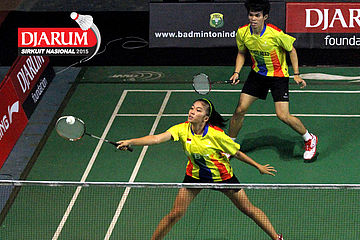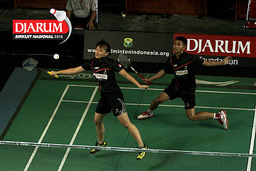 M. Shohibul Fikri/Tria Nur (Pusdiklat Telkom Jabar) menyambut pengembalian dari Kelvin Valentino/Vehrenica Debora (Candra Wijaya/Tangkas).
