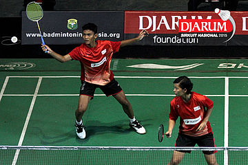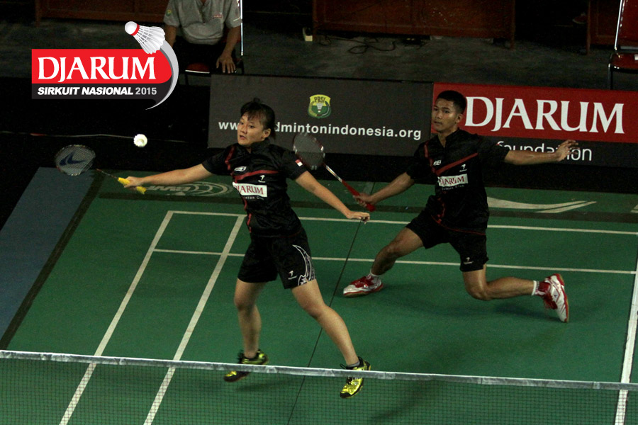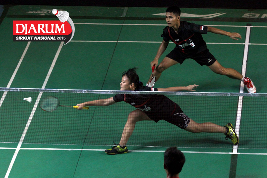 Kelvin Valentino/Vehrenica Debora (Candra Wijaya/Tangkas) mengembalikan shuttlecock ke arah M. Shohibul Fikri/Tria Nur (Pusdiklat Telkom Jabar).