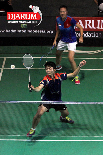 Kevin Ezra/Angelica Wiratama (Exist) berusaha menggapai pengembalian dari Akbar Basri/Andina Sisil (Hi Qua Wima).