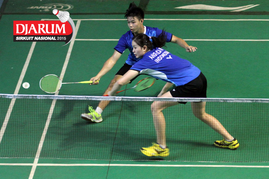 Ardy Nugroho/Agatha Imanuela (Djarum Kudus) mengembalikan shuttlecock ke arah Alan Muhammad/Dhiva Agretha (JR Enkei/SKO Ragunan).