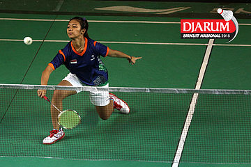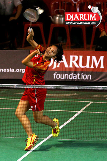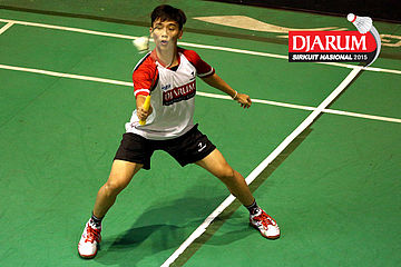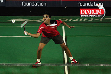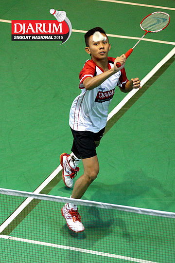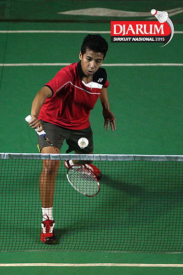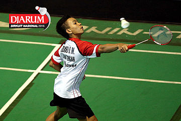 Ramdhani M. Zulkifli (Djarum Kudus) bersiap menyambar pengembalian tanggung dari Travis Moniaga (Tangkas).