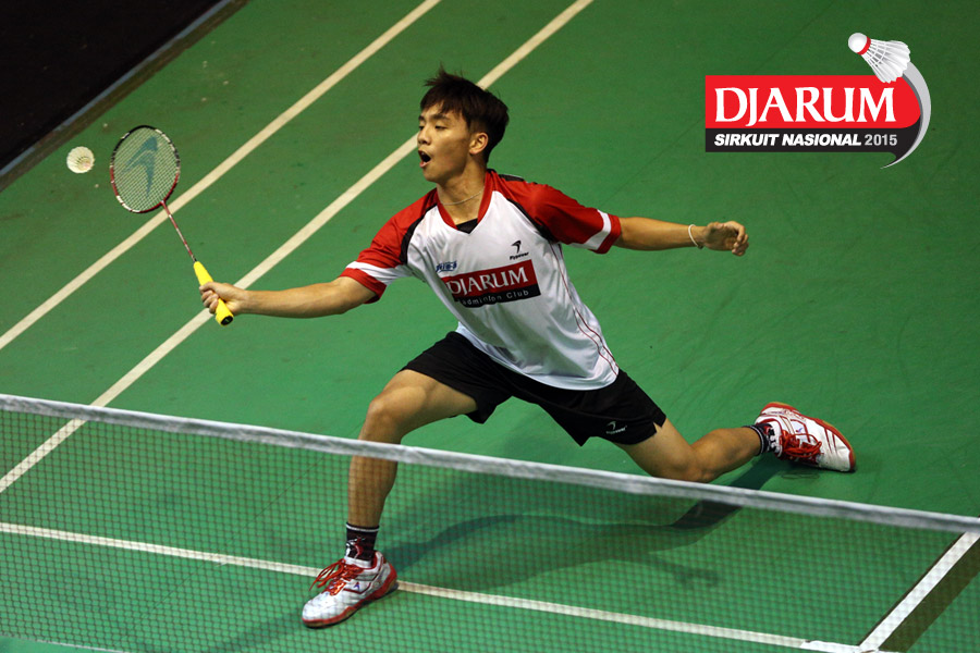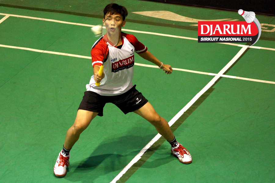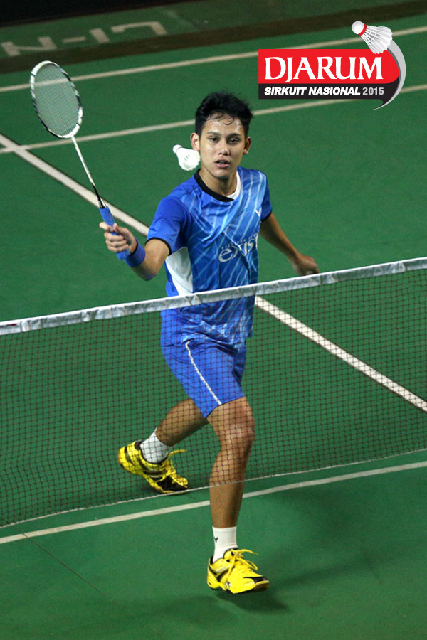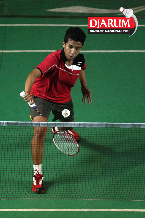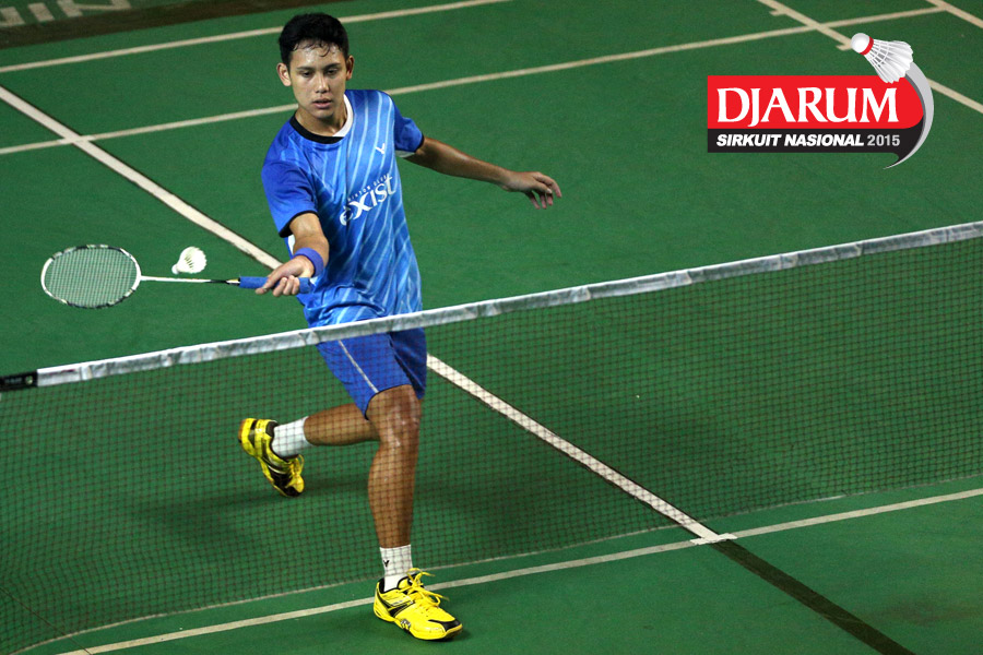 Ramdhani M. Zulkifli (Djarum Kudus) mengembalikan shuttlecock ke arah Travis Moniaga (Tangkas).