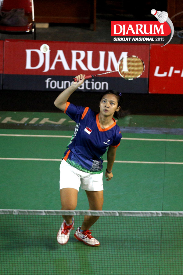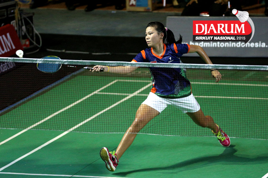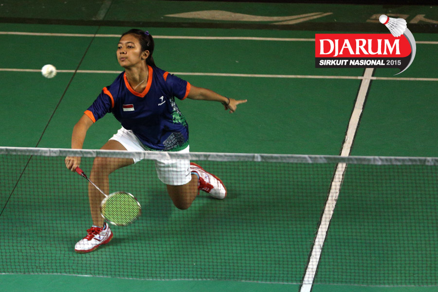 Made Deya Surya Saraswati (Pelatprov Bali) mengembalikan shuttlecock ke arah Vioni Florencya (Tangkas).