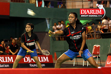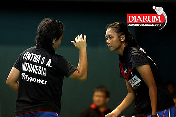 Cynthia Shara/Rofahadah Supriadi (Djarum Kudus) saling berkoordinasi.